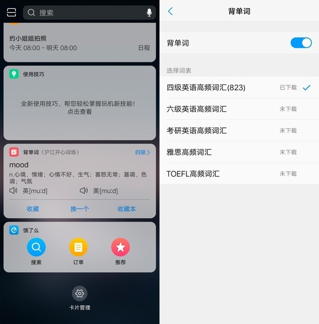 对在校大学生而言,背单词和饿了么这两个卡片就更是惊喜了。正在考英语的同学能够最终靠卡片管理调整卡片顺序,比如将背单词卡片放在Jovi智慧场景下方,收到球队比赛提醒之后,顺便背几个单词,充分的利用碎片时间。
